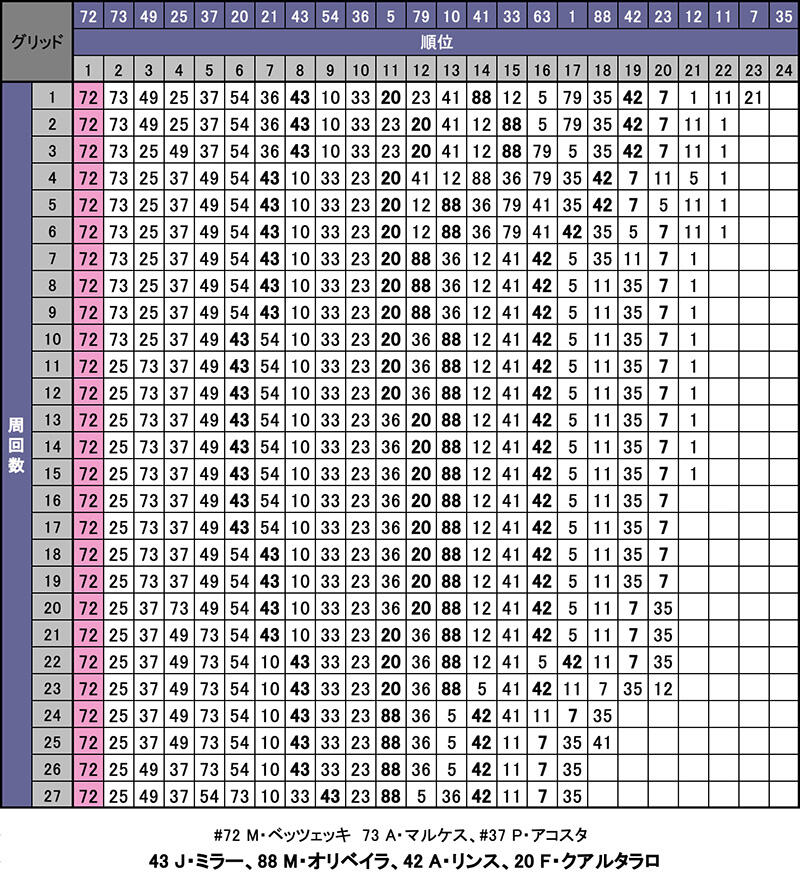 ミラー選手は8番グリッドの優位性を最大限に活用し、多くの時間帯で6~7番手を走行。しかし終盤はタイヤ・グリップの低下により思うようにペースが上がらず、徐々に順位を下げて9位でゴールした。